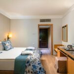 Стандартный номер в главном здании с видом на море, 26 кв. м, балкон, вид на бассейн, кондиционер, отдельная ванная комната, ванна, халат, тапочки, фен, бесплатные туалетно-косметические принадлежности, туалетная бумага, полотенца, белье, телевизор с плоским экраном, спутниковые каналы, бесплатный Wi-Fi, телефон, сейф, мини-бар, электрический чайник, шкаф, рабочий стол, розетка около кровати, защитные крышки на розетках, ковровое покрытие, отопление, звукоизоляция, сушилка для одежды, чистящие средства, антибактериальный гель для рук, детектор угарного газа, услуга «звонок-будильник», доступ на лифте.